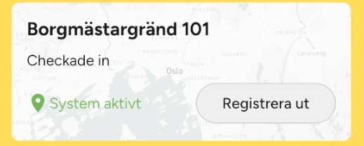 - Widgeten visar det projekt du senast checkade in på. Tryck på Registrera in/Registrera ut för att registrera dig in/ut på aktuellt projekt.