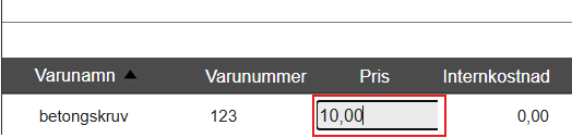 1. Klicka på fältet Pris och Internkostnad på den aktuella varan i varuöversikten.