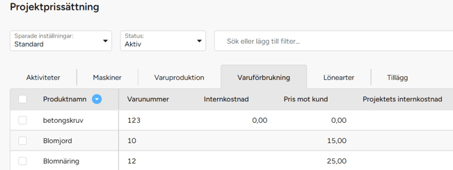 Hur sätter man standardpris och projektspecifika priser på varuförbrukning och varuproduktion?
