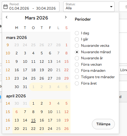 - Välj period för att visa tidsregistreringar inom önskat tidsintervall. Du kan välja mellan fördefinierade perioder som exempelvis Nuvarande vecka, Nuvarande månad eller Nuvarande år, eller ange en anpassad period genom att välja start- och slutdatum direkt i kalendern.
