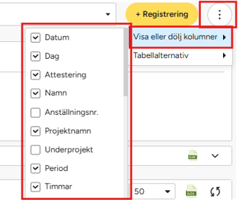 - Välj Tabellalternativ för att anpassa tabellen med tidsregistreringar. Här kan du bland annat välja: