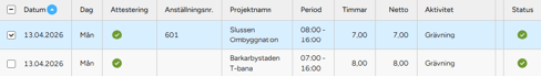 - Klicka på en av tidsregistreringarna i översikten för att visa detaljer. Alternativt bocka för aktuell tidsregistrering.