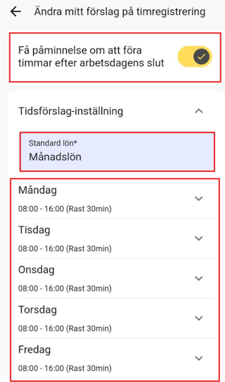 Välj om du vill ha en påminnelse om att registrera tid efter avslutad arbetsdag.